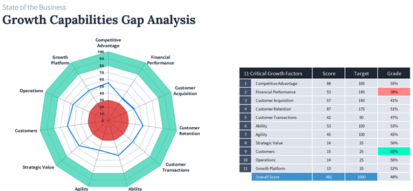 Replace internal guesswork with an external, objective view of how their company performs relative to sustained growth best practice. Learn what's working, what isn't, and where to next focus your efforts.